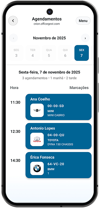 Com a App OG Oficinas Colaborador, pode visualizar todas as marcações agendadas para os próximos 15 dias. Esta funcionalidade permite consultar as informações essenciais de cada marcação e criar um novo documento associado ao agendamento.