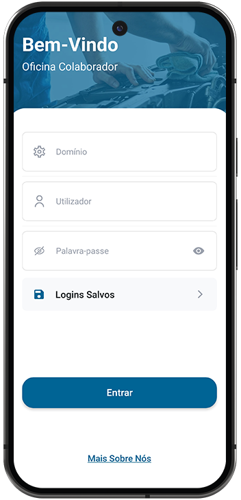 Para conseguir aceder à App deve preencher os campos pedidos com o domínio do Officegest da sua oficina, o nome do utilizador e a palavra-passe do colaborador.