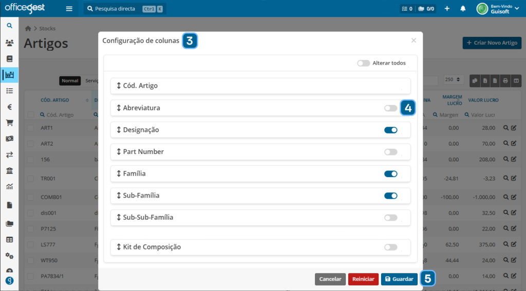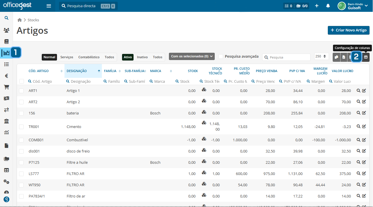 O Officegest permite personalizar as colunas das tabelas de artigos, ajustando a visualização às necessidades de cada utilizador.